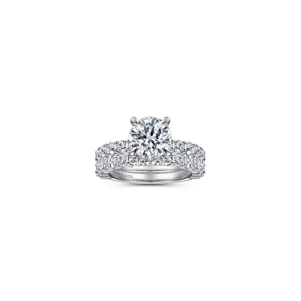 This 14 Karat White Gold Straight Design Engagement Mounting by Gabriel & Co. features 1.03 carats total weight of diamonds. The ring is designed to accommodate a 2.0 carat Round Center Diamond. (Center Diamond Price Not Included).